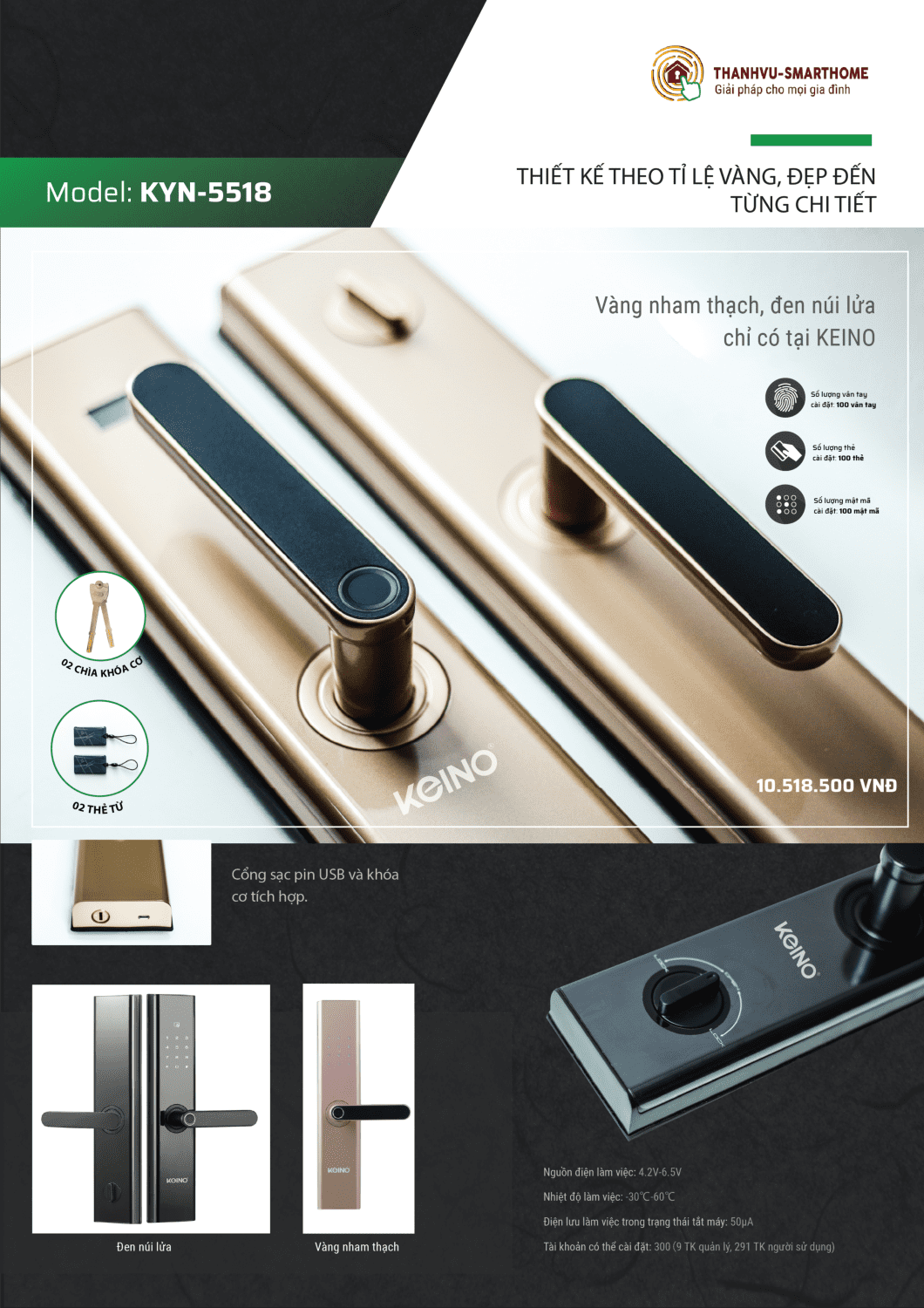 Khoá vân tay Keino KYN 5518 được thiết kế thanh mảnh, thon dài, tay cầm đặt cân đối giữa thân. Không hề góc cạnh như một số loại khoá trên thị trường hiện nay, thân máy bo tròn tạo cảm giác mềm mại. Sử dụng công nghệ in tràn viền IMD (In- Mold Decoration) nên trên thân của khóa không hề có vết hàn, vết dập gây rối mắt. Có thể nói công nghệ in này chỉ áp dụng trên các dòng khoá cao cấp.